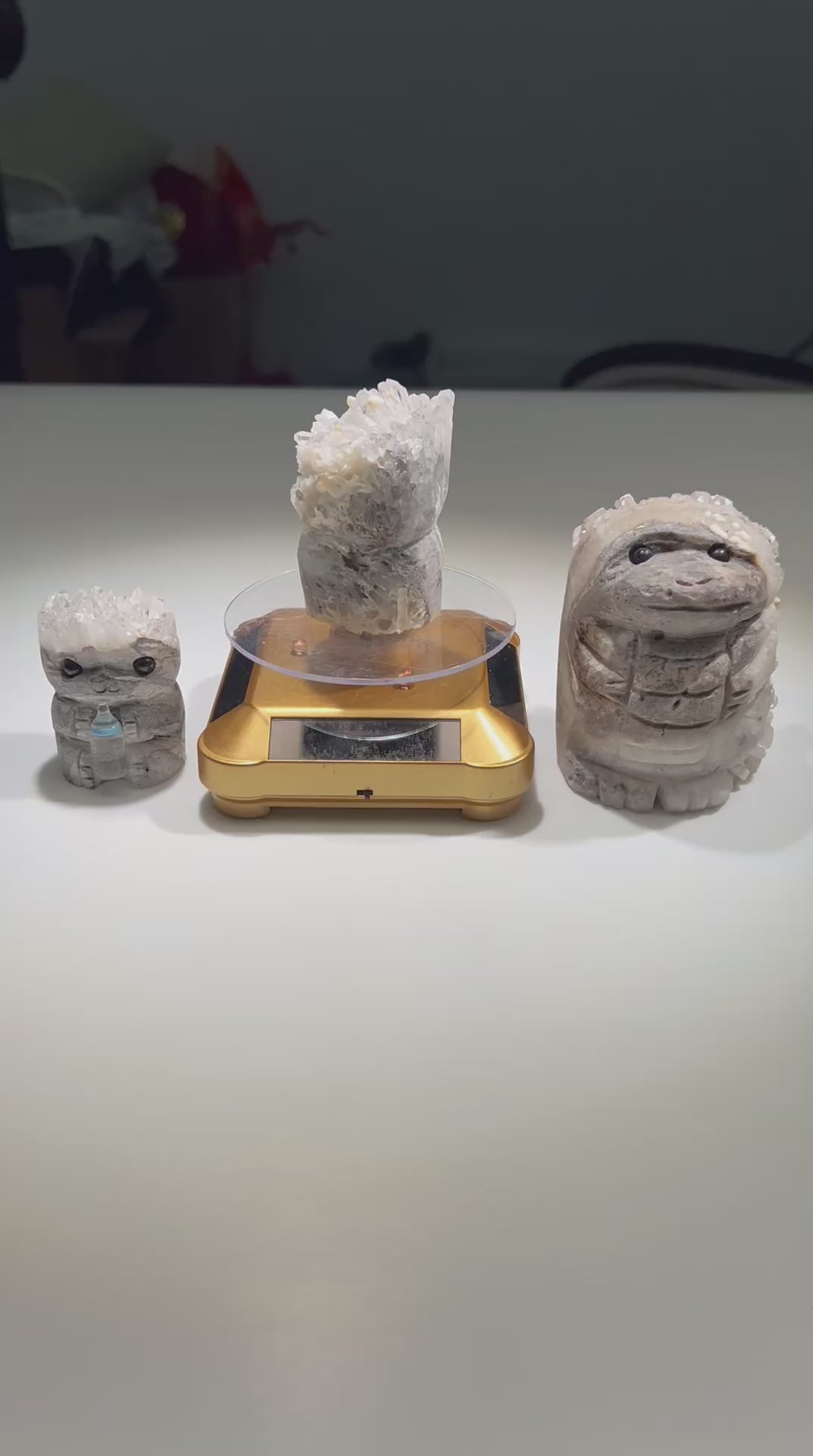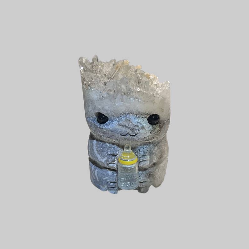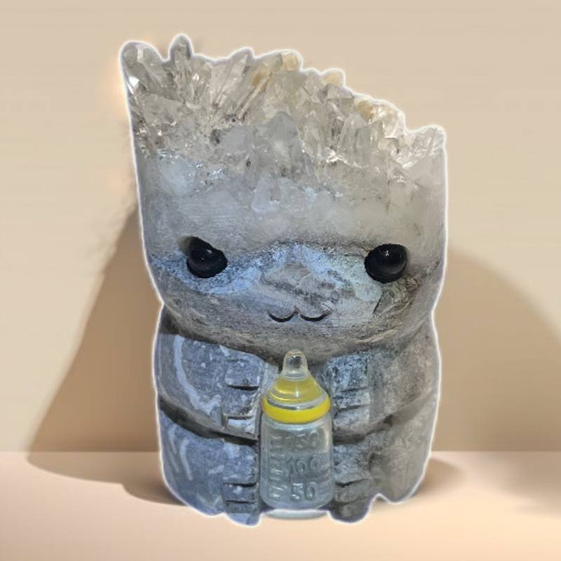 The White Crystal Cluster Engraving Groot is a captivating piece, crafted from a cluster of pristine white crystals intricately carved into the likeness of Groot, the beloved character from Guardians of the Galaxy. Each delicate detail of Groot's form, from his gentle expression to the intricate texture of his bark-like exterior, is meticulously engraved into the surface of the crystal cluster.