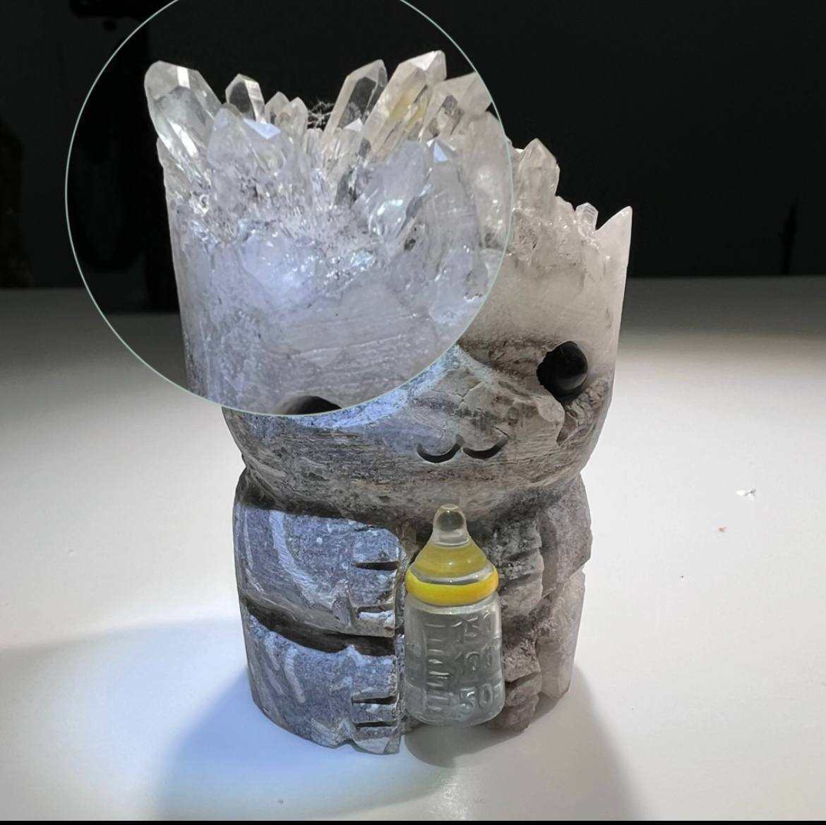 The cluster itself is composed of numerous small white crystals, each reflecting light in a dazzling display of brilliance. The overall effect is both enchanting and ethereal, as if Groot himself has been frozen in a moment of serene contemplation within the crystalline depths.