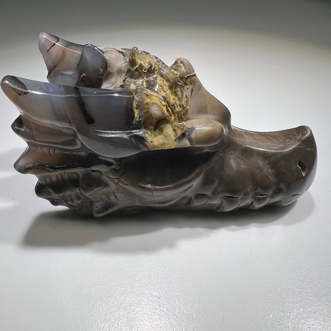 Whether displayed as a decorative accent or cherished as a symbol of strength and protection, the Volcanic Agate Dragon Head is sure to leave a lasting impression, offering a glimpse into the captivating interplay of light and color that lies within its volcanic agate exterior.