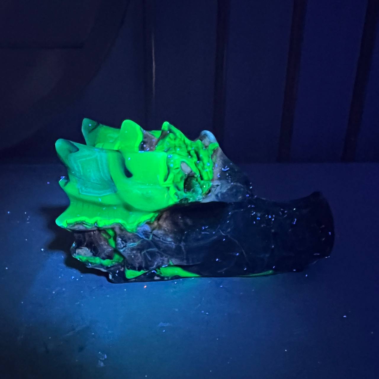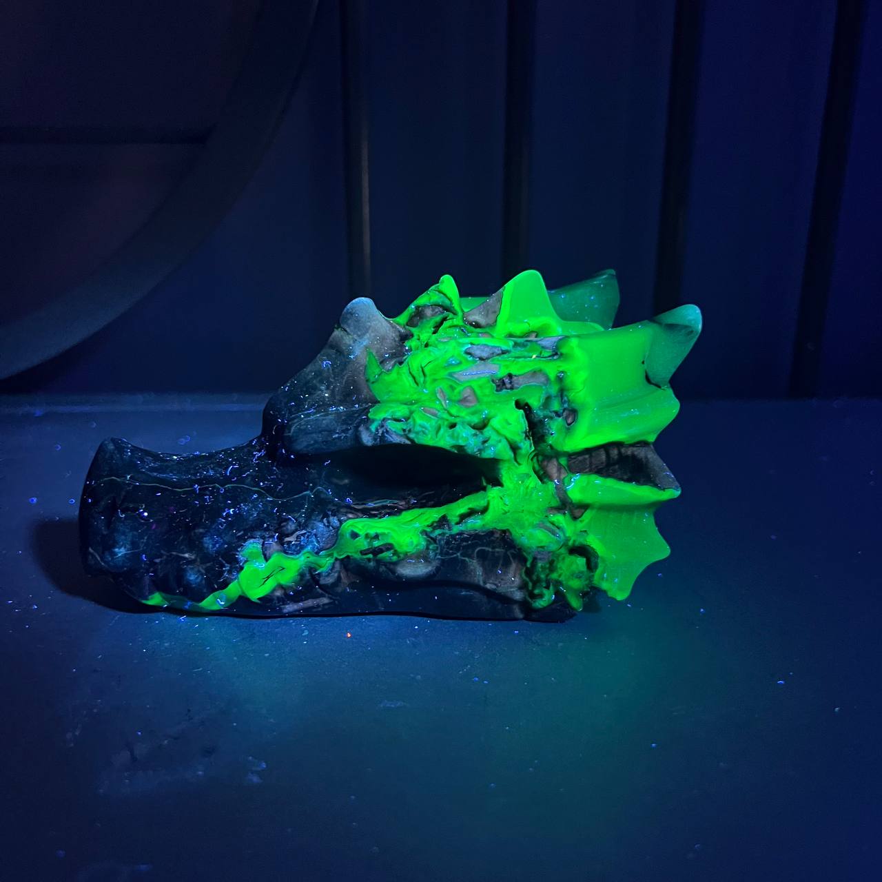 Under natural light, the volcanic agate patterns on the dragon head's surface showcase a mesmerizing array of rich reds, oranges, and blacks, reminiscent of molten lava and volcanic activity. However, when exposed to UV light, a remarkable transformation takes place, revealing hidden depths of color and brilliance.