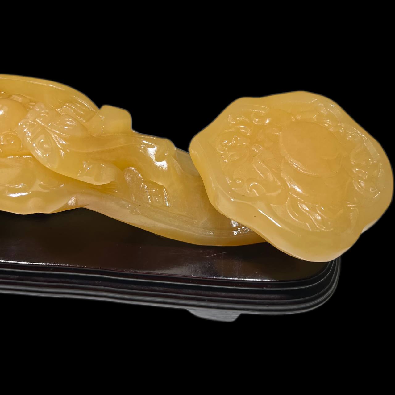 The topaz jade's warm golden tones shimmer in the light, casting a radiant glow that enhances the beauty of the Ruyi. Its smooth and polished surface invites touch, inviting a tactile connection with the piece and further highlighting the craftsmanship that went into its creation.