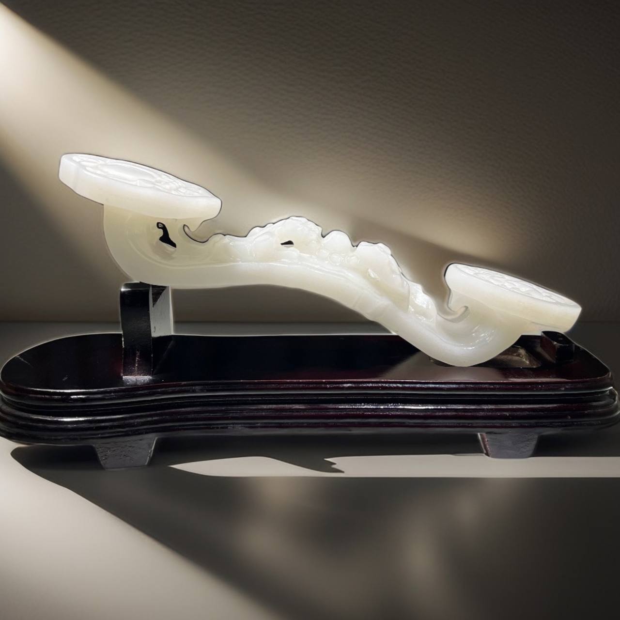 The Ruyi, a traditional Chinese scepter symbolizing power, prosperity, and good fortune, is rendered with meticulous attention to detail. Its elegant curve and graceful contours evoke a sense of harmony and balance, while the intricate carvings adorning its surface add depth and character to the piece.